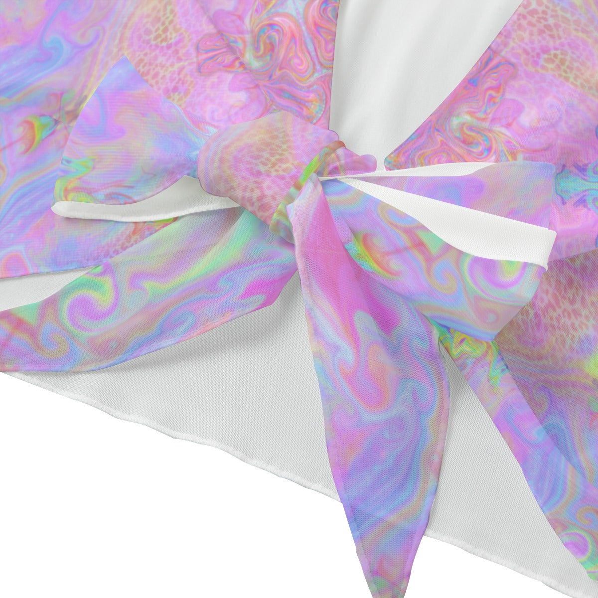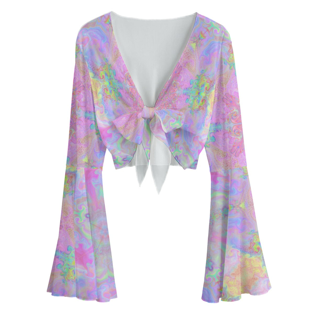 This bell sleeve mesh top is the perfect statement piece for your next rave or festival adventure. Made from lightweight, breathable mesh, it features dramatic bell sleeves that add a touch of flowy elegance to your dance moves. The tie-front design allows for adjustable coverage, making it versatile enough to wear alone or layered over your favorite bralette or crop top. Its sheer, shimmering fabric catches the light, creating an ethereal look that’s both edgy and enchanting. Pair it with your favorite high-waisted bottoms or a matching mesh skirt to complete the ultimate rave-ready ensemble.