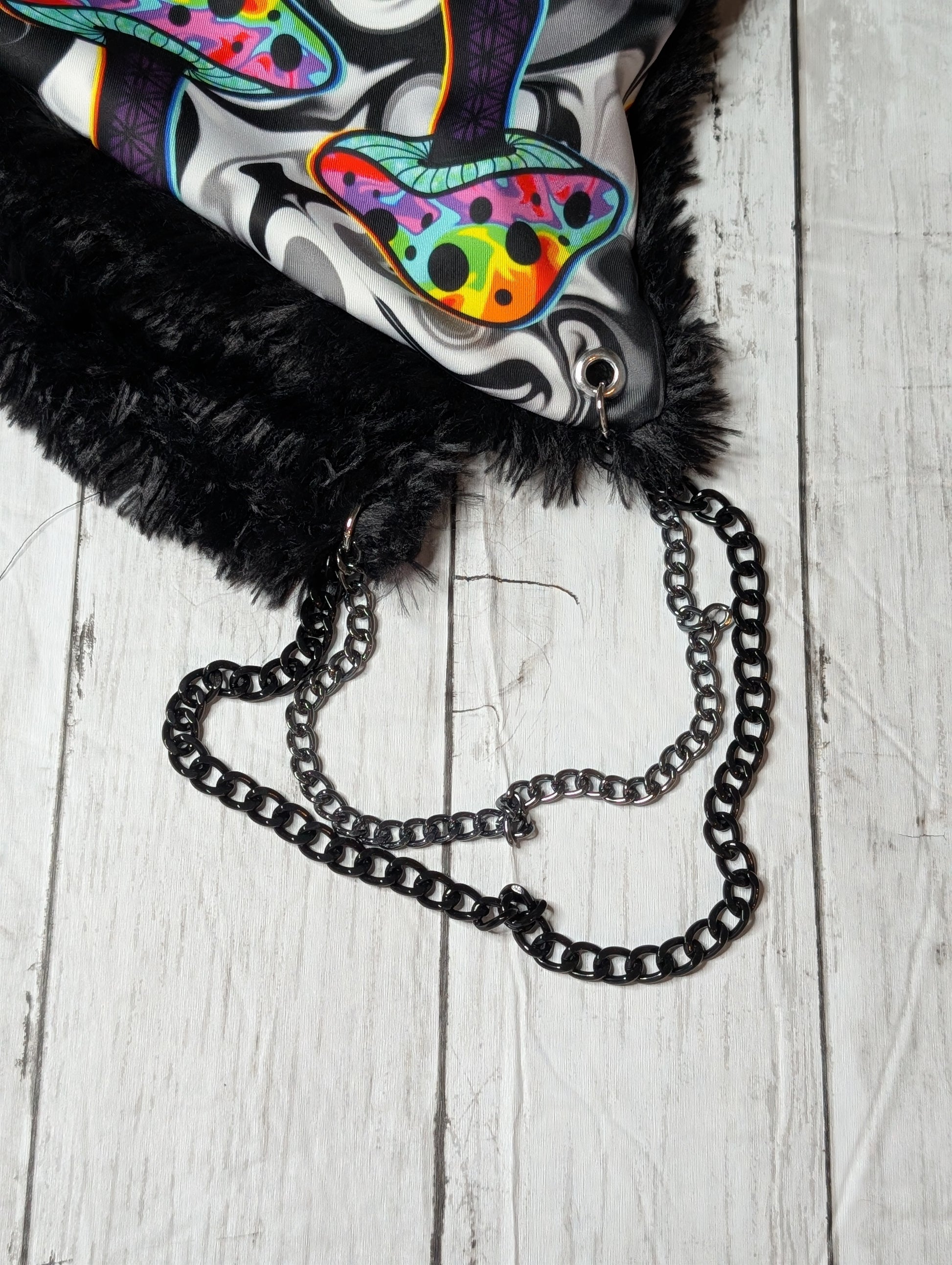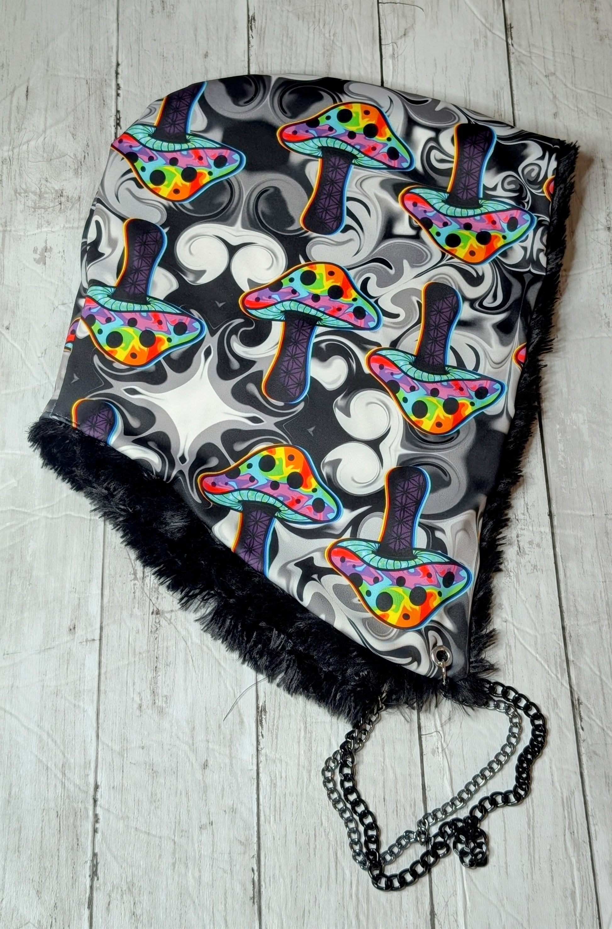 The Mushie Madness hood is the perfect accessory for your deep wubby nights or headbanging at the rail. Handmade custom rave hoods made with patience love and pride. These hoods are the perfect accessory for anyone that gets overstimulated at raves or festivals. They block out a little noise and feel like a hug on your head. All of the hoods featured are hand made and reversible using high quality fabrics/designs with seamless stitching. They all come with eyelet reinforced holes and custom chains to match every design. The chain is doubled up to give enough weight to keep your hood weighed down as to not slip off easily.