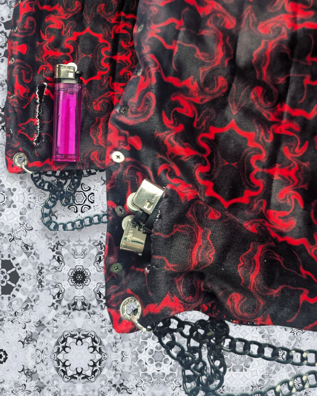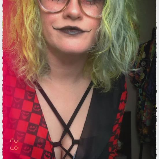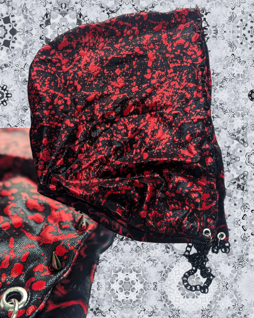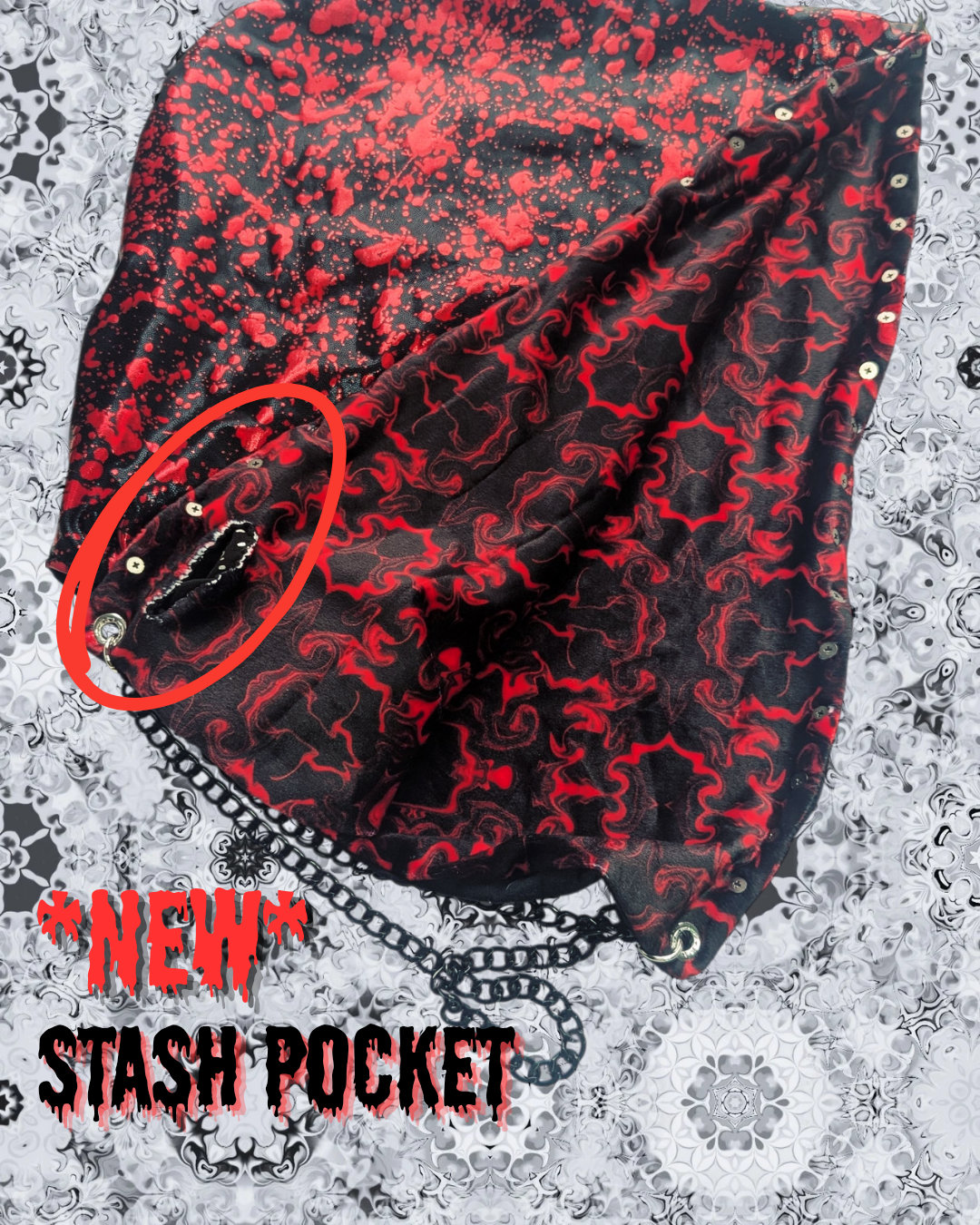 The XL Halloween hood is the perfect accessory for your deep wubby nights or headbanging at the rail. This hood features a stash pocket capable of holding 2 lighters and survived the headbanger test! Handmade custom rave hoods made with patience, love and pride. These hoods are the perfect accessory for anyone that gets overstimulated at raves or festivals. They block out a little noise and feel like a hug on your head. All of the hoods featured are hand made and reversible using high quality fabrics/designs with seamless stitching. They all come with eyelet reinforced holes and custom chains to match every design. The chain is doubled up to give enough weight to keep your hood weighed down as to not slip off easily.